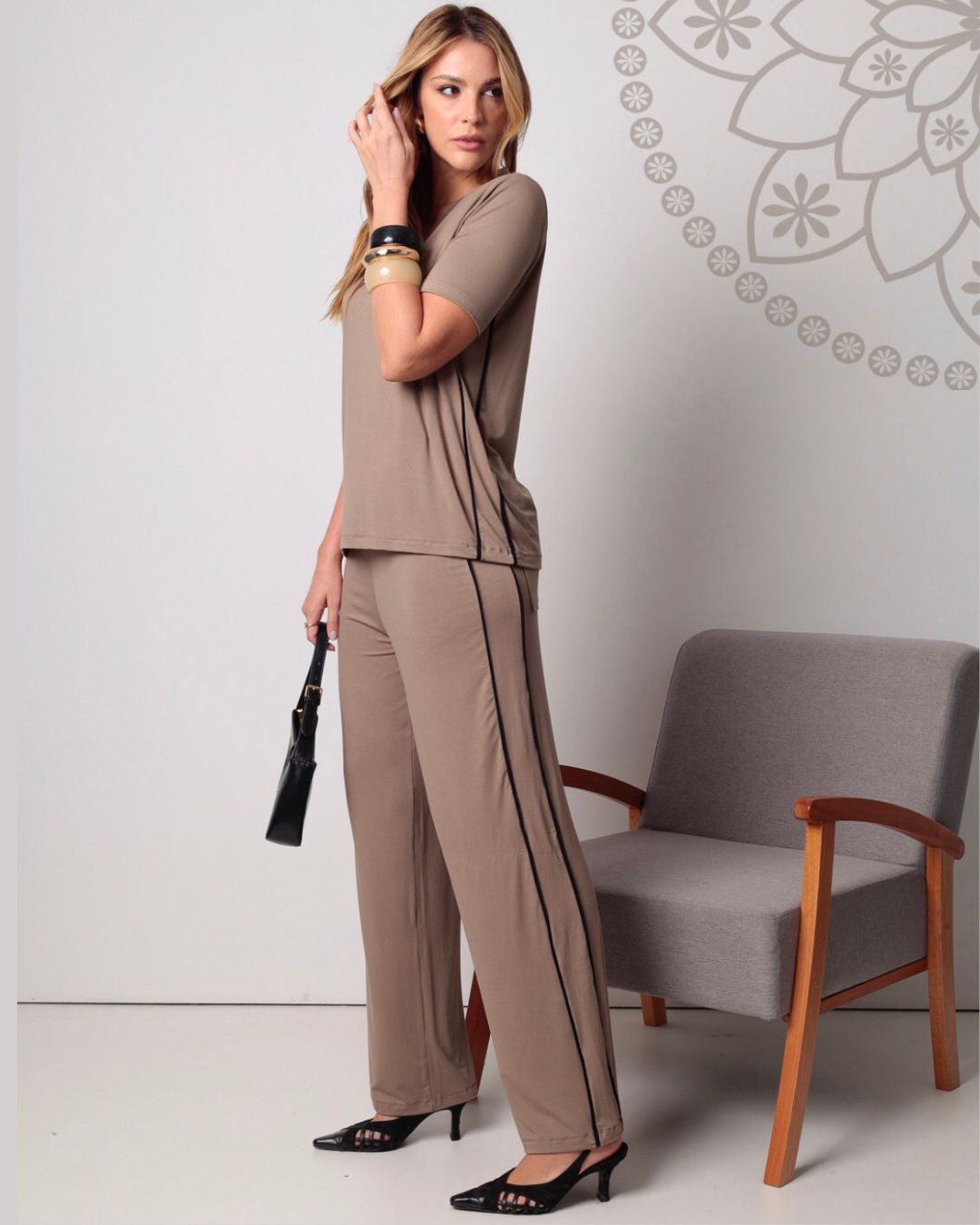 Conjunto com blusa e calça, com corte moderno e amplo, produzido em viscose com elastano, para um caimento perfeito e cheio de conforto