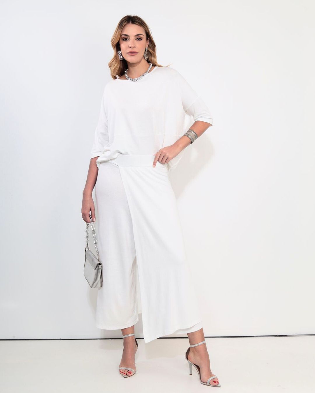 Conjunto com blusa e pantacourt, tipo Saia fake, produzido em viscose com elastano texturizada. Perfeito para um look casual, deixando o visual elegante