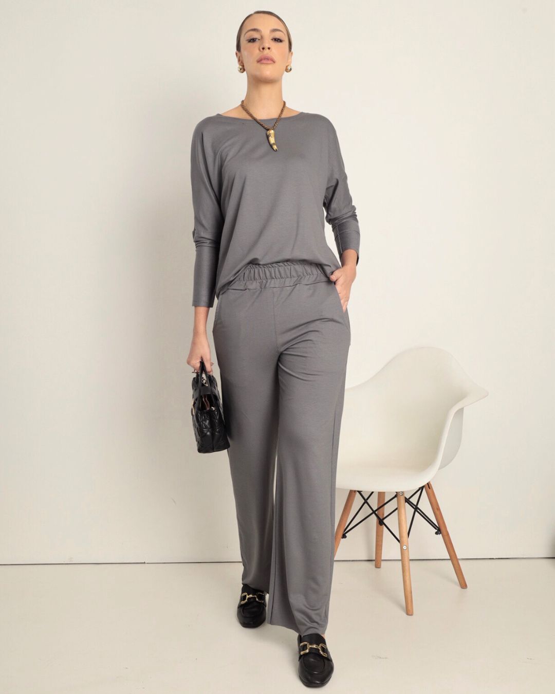 Conjunto de calça e blusa com manga diferenciada, produzido em moletinho .