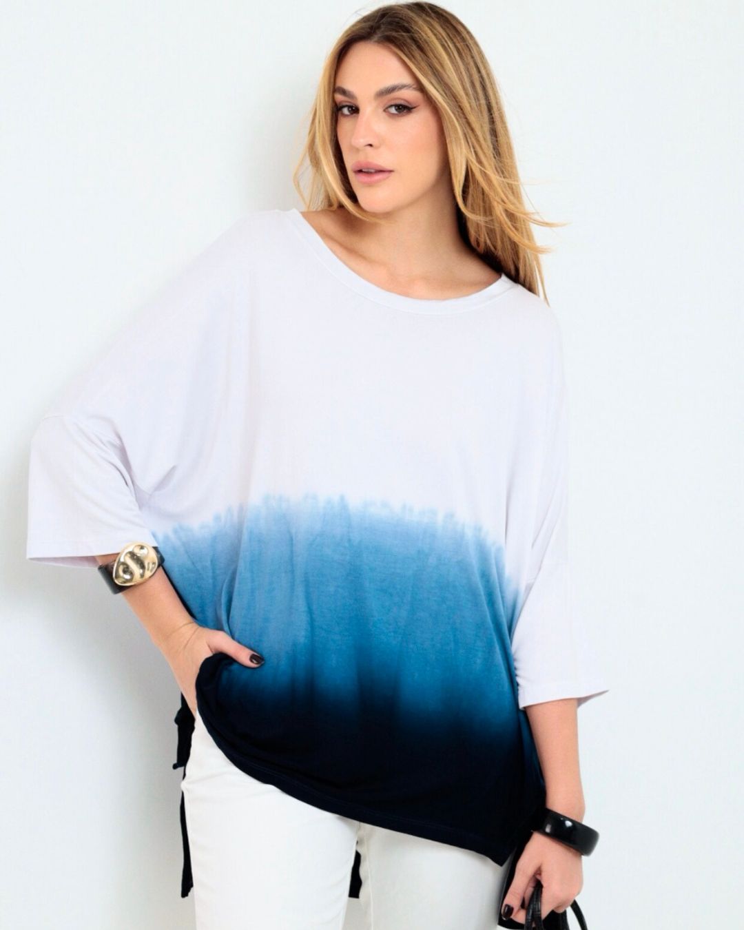 Blusa com corte Amplo, Assimétrico e Moderno, produzida em viscose com elastano e tingida manualmente para obter o degradê incrível.