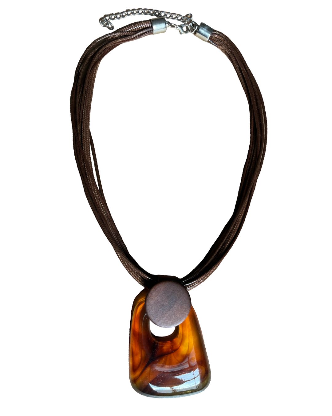 O colar apresenta um pingente em resina com detalhes coloridos que se misturam com a madeira, proporcionando uma peça única. Os fios de algodão formam a base do colar, conferindo leveza e ajuste confortável ao pescoço. O fechamento em metal com extensor permite ajuste no comprimento para melhor encaixe.