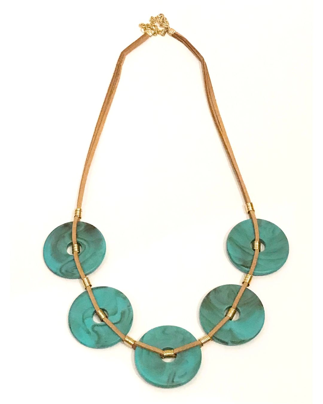 Colar com fio tipo camurça, com peças de metal dourado e resinas turquesas, para complementar seu look, valorizando ainda mais o seu visual, deixando-o moderno e estiloso.