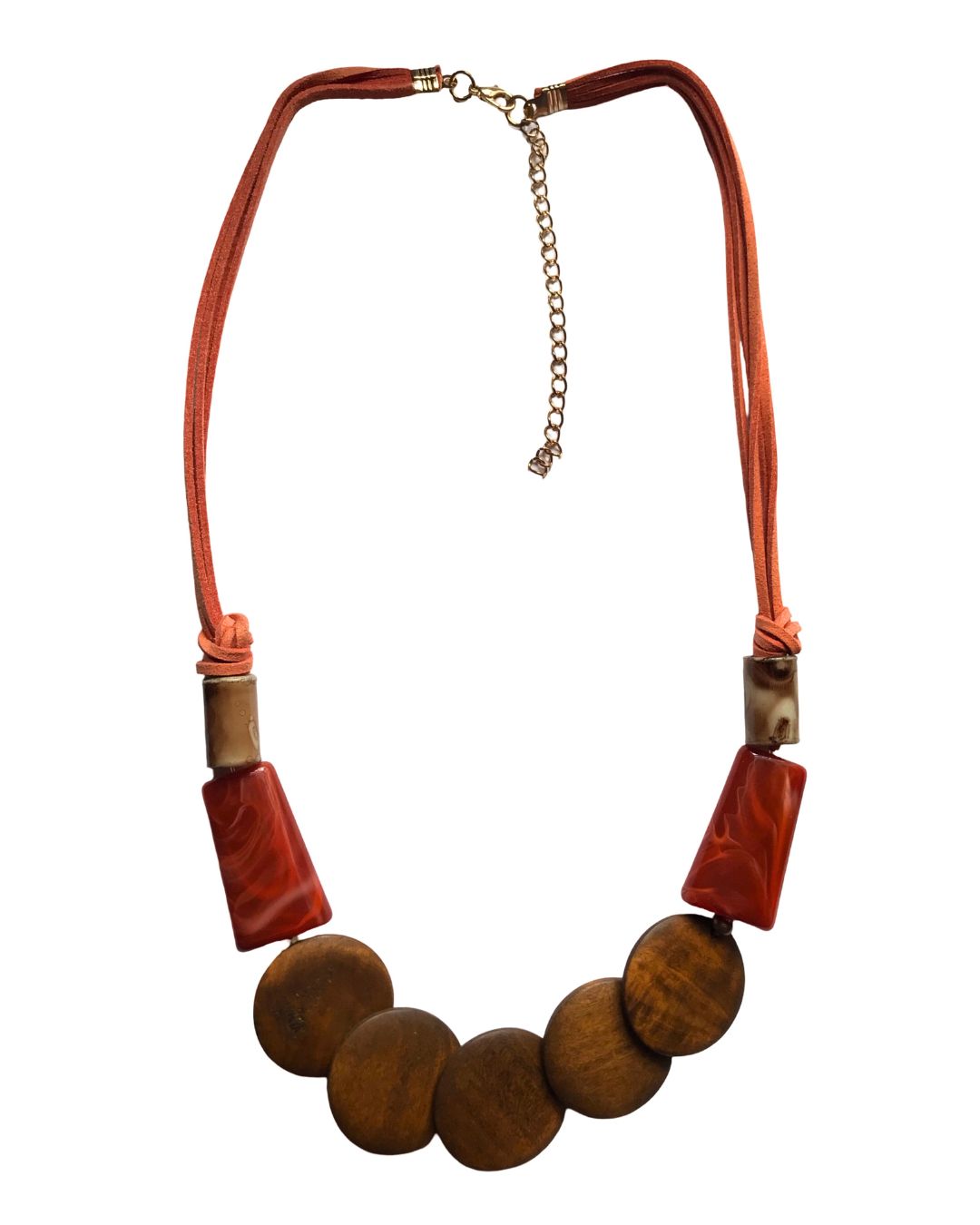 Colar em fio tipo camurça, com contas de resina  e madeira