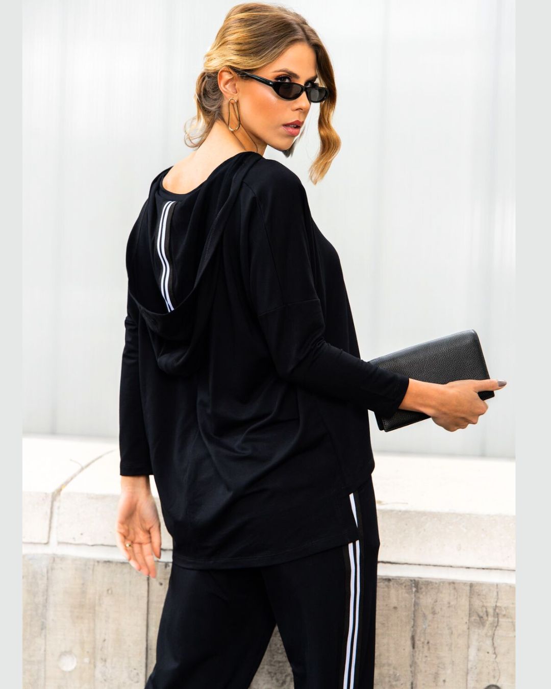 Conjunto em Moletinho Premium, com detalhes de listras na calça e no capuz, dando mais estilo e modernidade ao visual