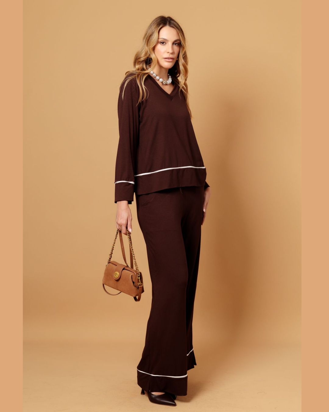 Conjunto feito em viscose com elastano, que oferece toque confortável e caimento ideal para o dia a dia. A gramatura de 250 garante tecido de qualidade superior, perfeito para um look casual elegante com detalhes em off white que valorizam a peça. O conjunto inclui blusa de manga longa e calça com modelagem soltinha para conforto e estilo.