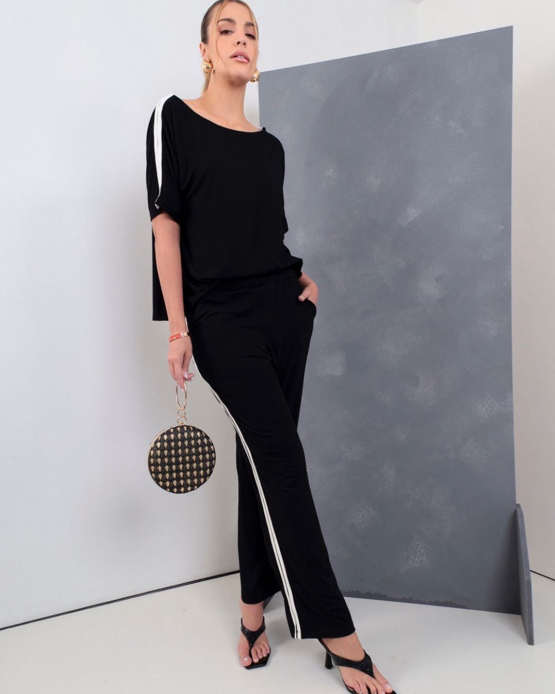 Conjunto com Blusa e Calça, com listas laterais, produzido com viscose e elastano premium. Versátil, Prático, Confortável, é ideal para um look casual cheio de estilo e elegante ou para levar na mala de viagem.