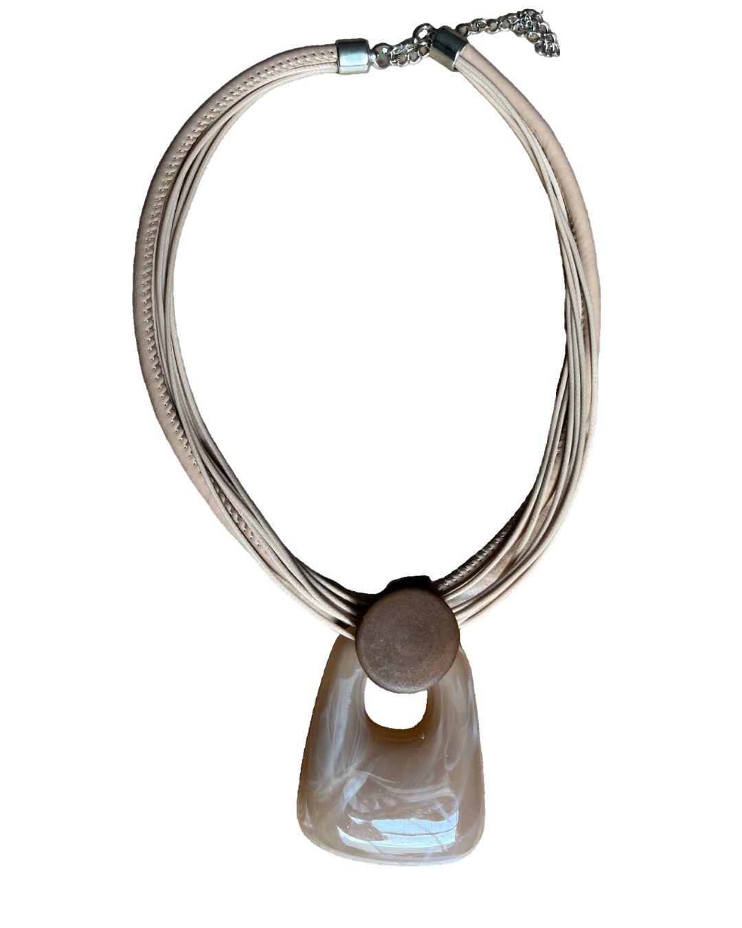 O colar apresenta um pingente em resina com detalhes coloridos que se misturam com a madeira, proporcionando uma peça única. Os fios de algodão formam a base do colar, conferindo leveza e ajuste confortável ao pescoço. O fechamento em metal com extensor permite ajuste no comprimento para melhor encaixe.