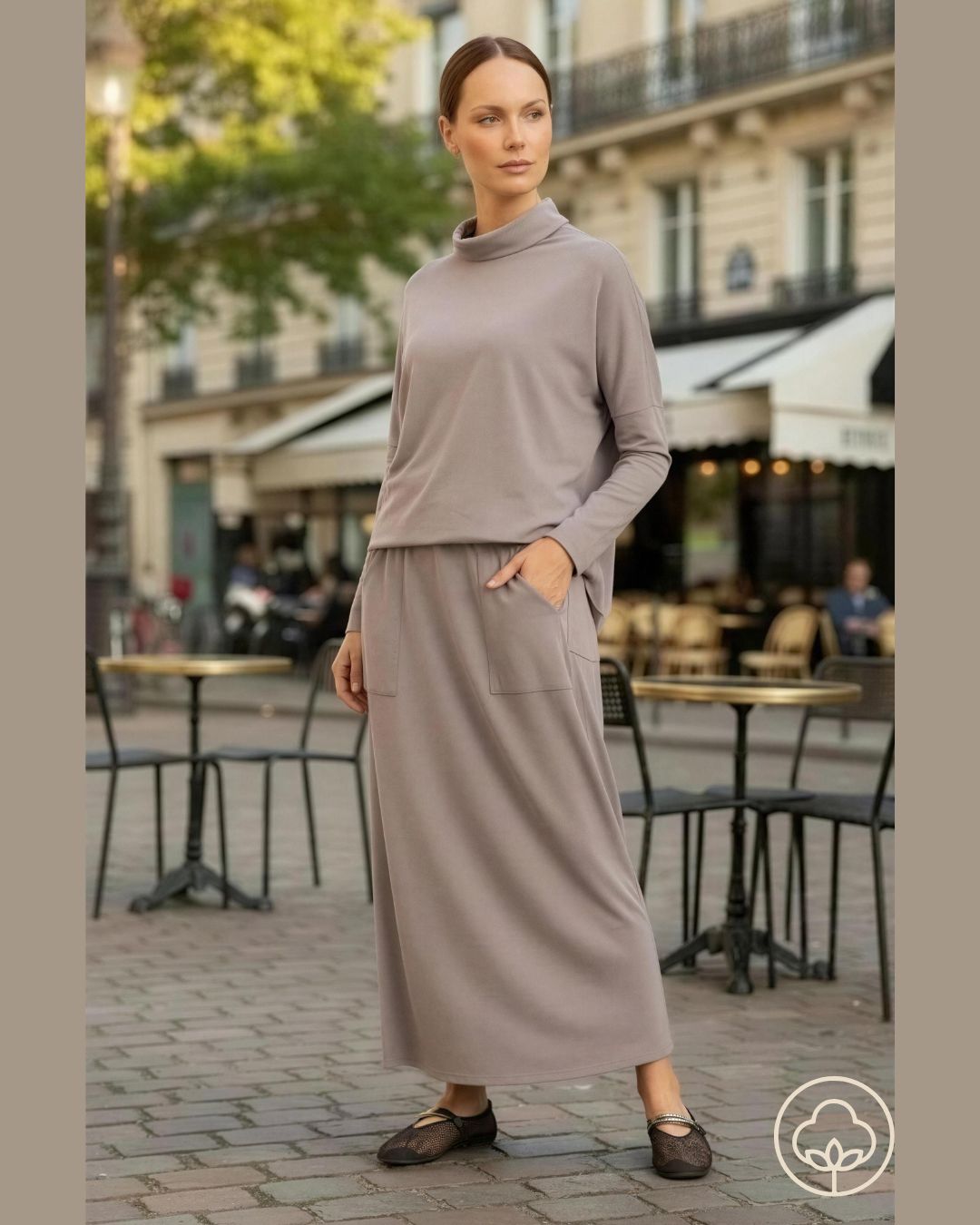 A saia longa Dublin tem caimento alongado e leveza, perfeita para um look casual porém sofisticado. A cor cinza é neutra e fácil de combinar no dia a dia. Ideal para quem busca conforto sem abrir mão do estilo.