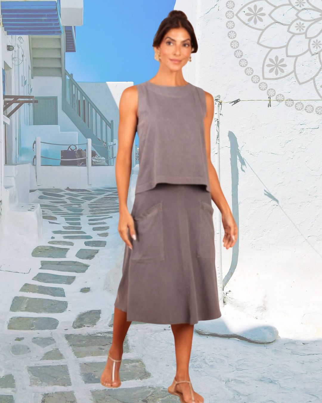 Saia Midi com corte soltinho e moderno, produzido em malha 100% algodão. Perfeito para um look Casual Contemporâneo.