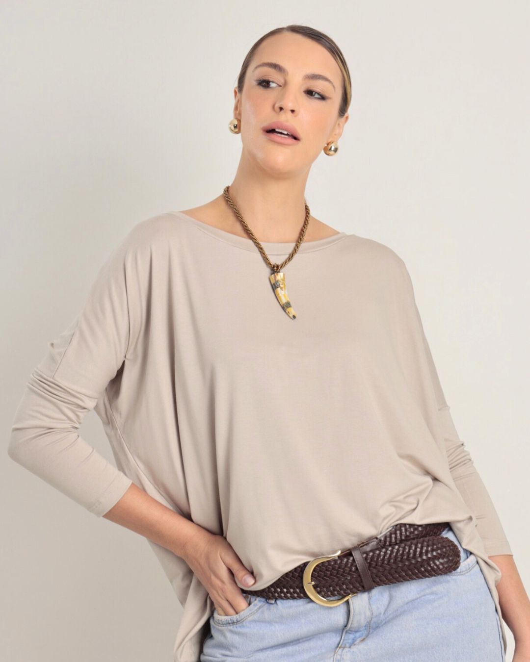 Blusa c/ modelagem ampla, confortável e cheia de estilo. Ideal p/ criar um look casual ou sofisticado Tecido: Viscose com elastano ( viscolycra ) Tamanho Único (veste até 48) Medidas : Busto 144, cintura 144, quadril 144, comprimento 69